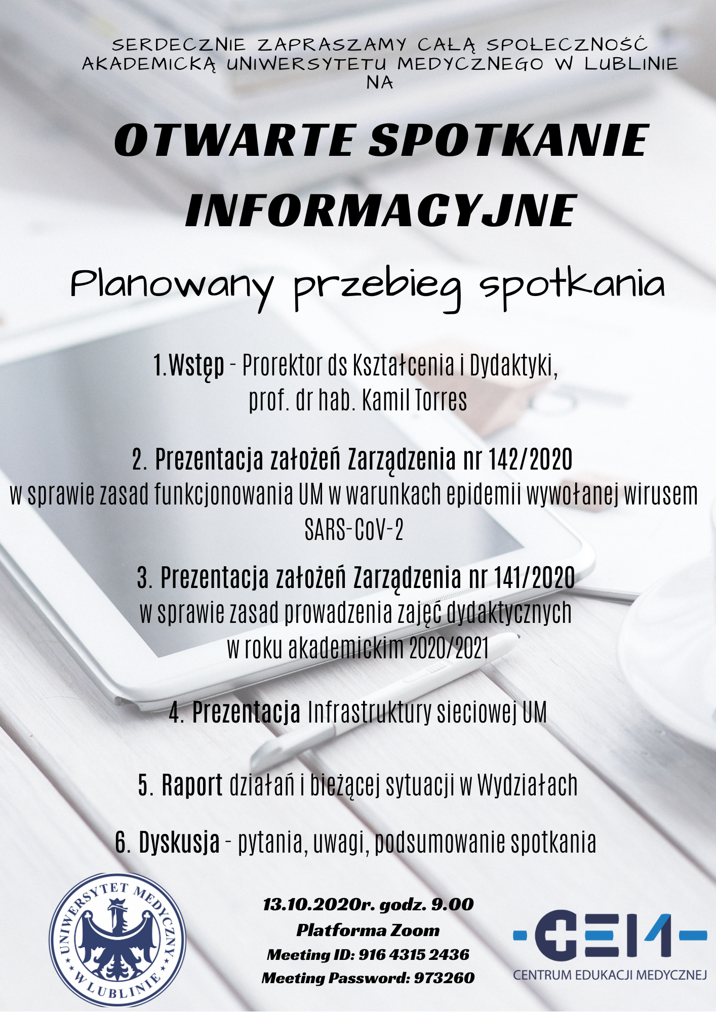 - Trwają prace nad aktualizacją Zarządzenia Rektora dotyczącego organizacji kształcenia w celu umożliwienia organizacji zajęć w sposób asynchroniczny; w celu przyspieszenia prac nad harmonogramami zajęć przez zespoły wydziałowe planowane jest wydanie informacji o planowanych w tym zakresie działaniach umożliwiające podjęcie prac przed formalnym wydaniem zarządzenia;